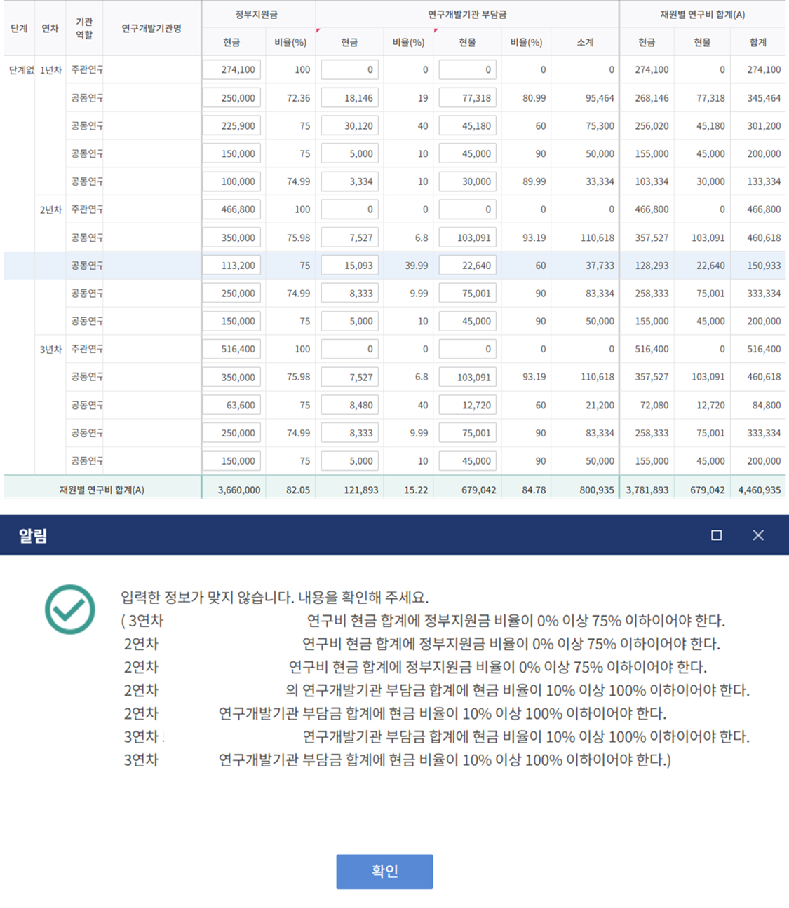 위 이미지는 정부과제 온라인 신청 시 각 연차별 연구개발비에서 정해진 비율을 준수하지 않고 잘못 입력하였을 경우 내용 수정을 요청하는 알림창입니다.
