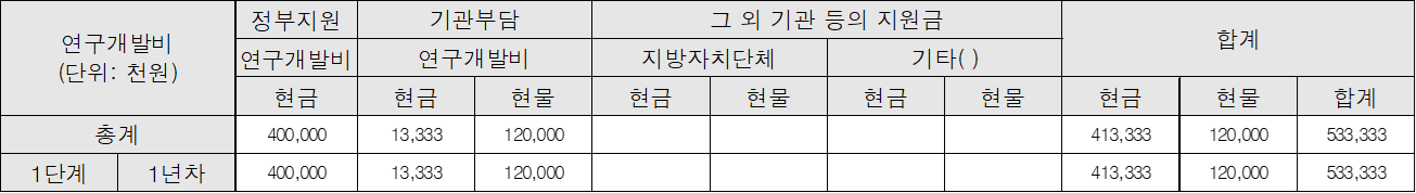 총 연구개발비(533,333)에서 정부지원 연구개발비(400,000)를 빼면 기관부담 연구개발비의 총액(133,333)을 구할 수 있습니다. 이때 기관부담 연구개발비의 10% 이상이 현금이어야 하기 때문에 10%인 13,333을 현금 부문에 작성하고 그 나머지 부분을 현물로 작성합니다.
